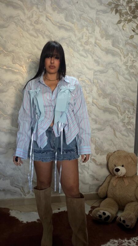 Camicia in cotone a righe, con fiocchi e lacci regolabili (si puó tenete lunga oppure accorciarla ) , modello largo con spacchi laterali ,veste XS-XL